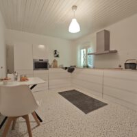 Durch die Haustür betreten Sie die Eingangshalle, links daneben befindet sich das Kaminzimmer. Die Fußböden hier sind mit Travertin und mit Fußbodenheizung ausgestattet. Daneben liegt die gemütliche Küche mit Vorratskammer.