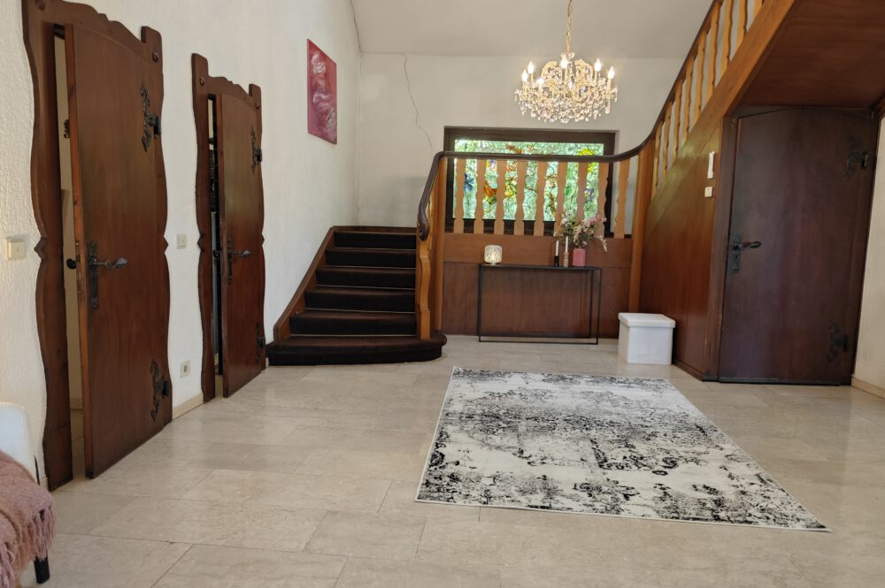 Auf der rechten Seite folgen dann eine Garderobe, ein Gäste-WC, ein großes Bad mit Wanne und Dusche sowie das imposante Treppenhaus.